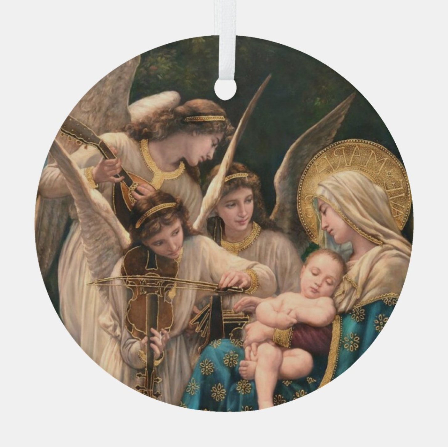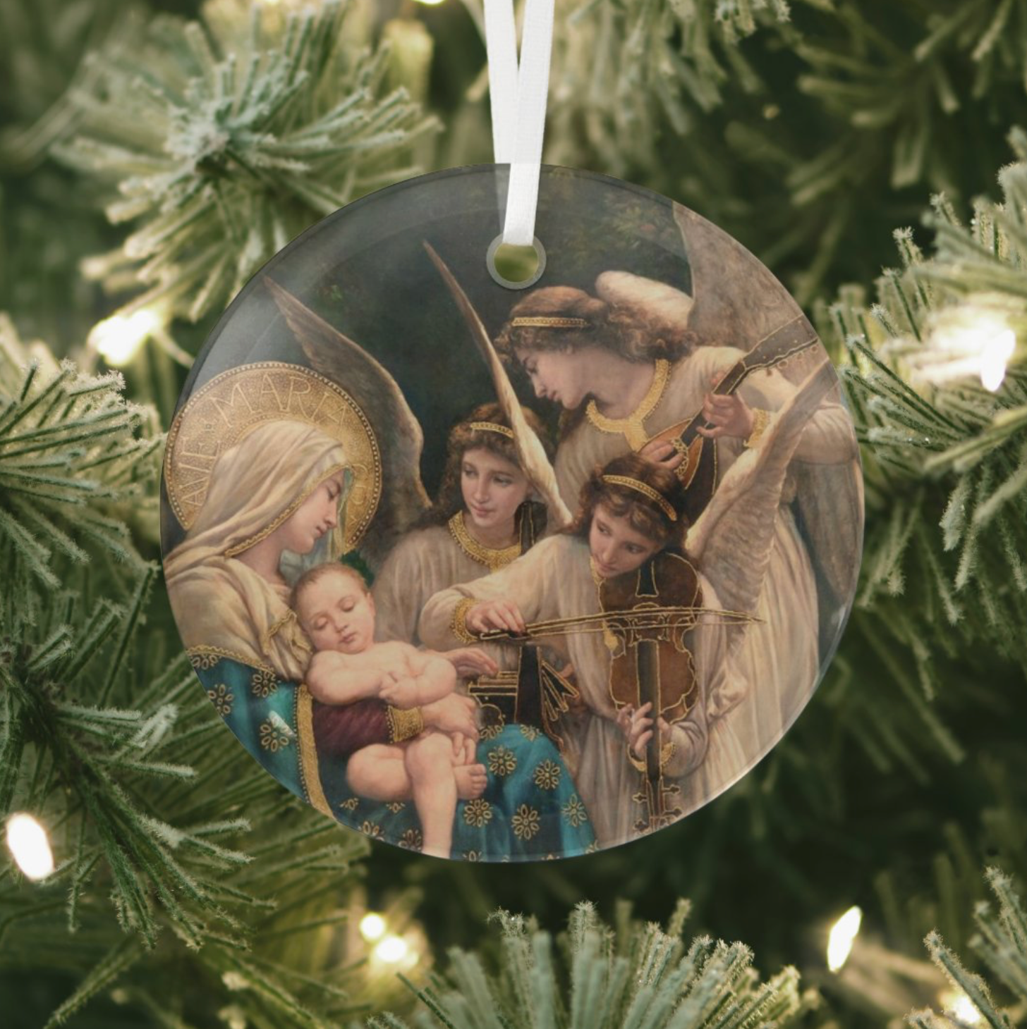 Ovaj božićni ukras od stakla prikazuje Blaženu Mariju Djevicu s djetetom Isusom. Okruženi su anđelima koji nježnom glazbom slave Spasitelja. Klasični, mekani slikarski stil čini ovaj ukras bezvremenskim simbolom Božića, savršenim za božićno drvce ili kao dar s duhovnim značenjem.