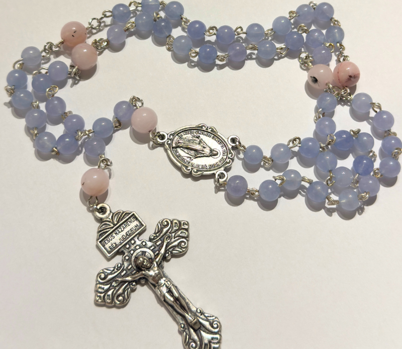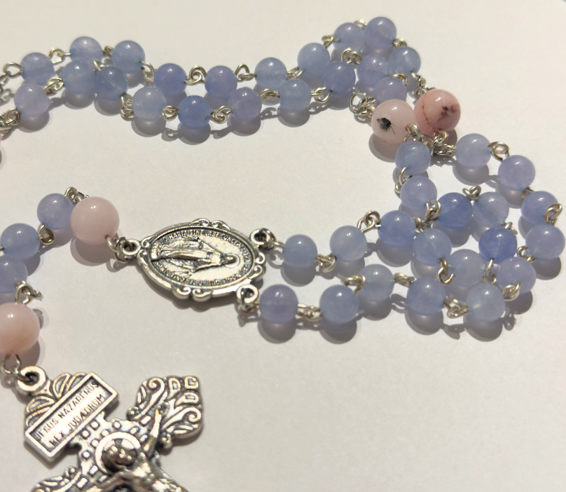 Ručno je rađena s pažnjom i poštovanjem prema tradiciji katoličke molitve. Desetice su promjera 6mm, a perle koje ih razdvajaju 8mm. Desetice su perle od svijetloplavog žada, a odvojene su perlama od rozog opala.